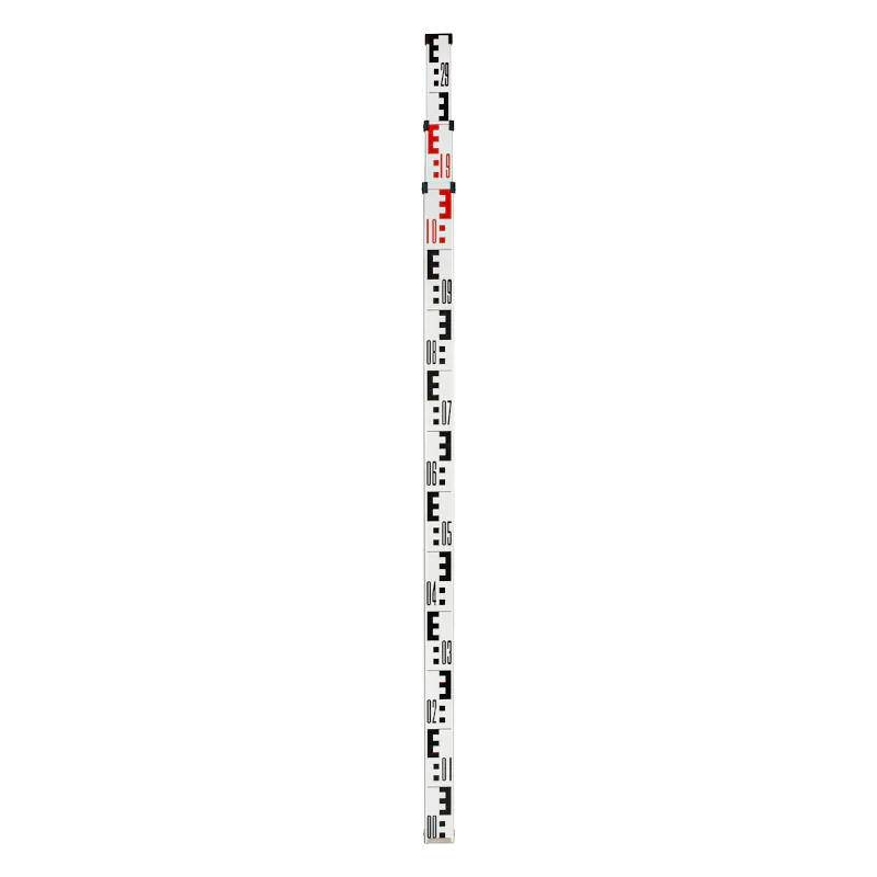 Телескопическая рейка состоит из трех выдвижных секций, раскладывается до 3 м, имеет сантиметровую Е-шкалу и миллиметровую градуировку. Погрешность измерений не превышает 1 мм. Пузырьковый уровень упрощает выравнивание прибора.