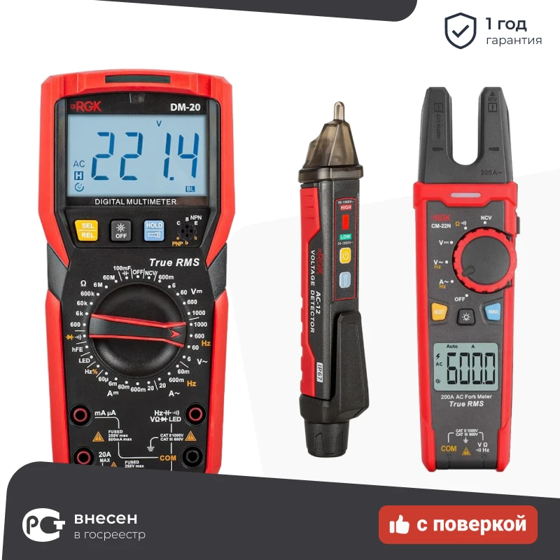 RGK DM-20 цифровой мультиметр с поверкой, с токовыми клещами CM-22N и индикатором напряжения AC-12 779647/721487/776394 в Нижнем Новгороде