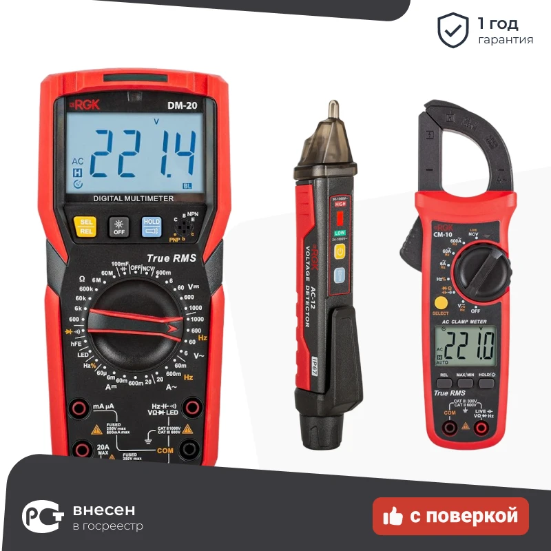 RGK DM-20 цифровой мультиметр с поверкой, с токовыми клещами CM-10 и индикатором напряжения AC-12 779647/779678/776394 в Нижнем Новгороде