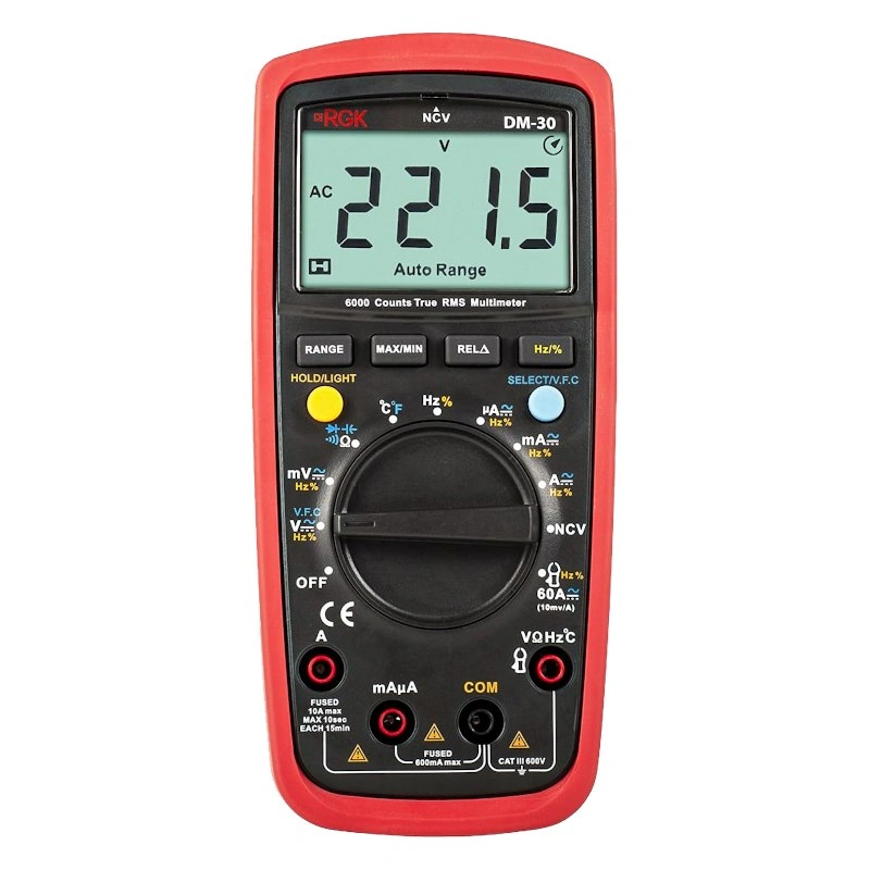 Цифровой мультиметр RGK DM-30 измеряет напряжение до 600 В, постоянный и переменный ток до 10 А, сопротивление 0,6 кОм–60 МОм, частоту и коэффициент заполнения. Измеритель также может использоваться для проверки исправности диодов, конденсаторов и целостности цепи, измерения емкости в диапазоне 0,01–100000 мкФ и температуры от -20ºС до +400ºС, бесконтактного обнаружения напряжения в розетках и проводах. Соответствие стандарту защиты САТ III 600 В позволяет мультиметру RGK выдерживать кратковременные скачки высокого напряжения. Прибор зарегистрирован в Госреестре под номером 81409-21. Данные о действующей поверке можно посмотреть в онлайн-системе ФГИС «Аршин».