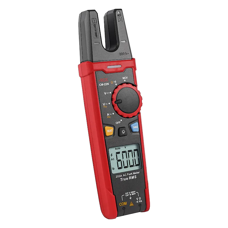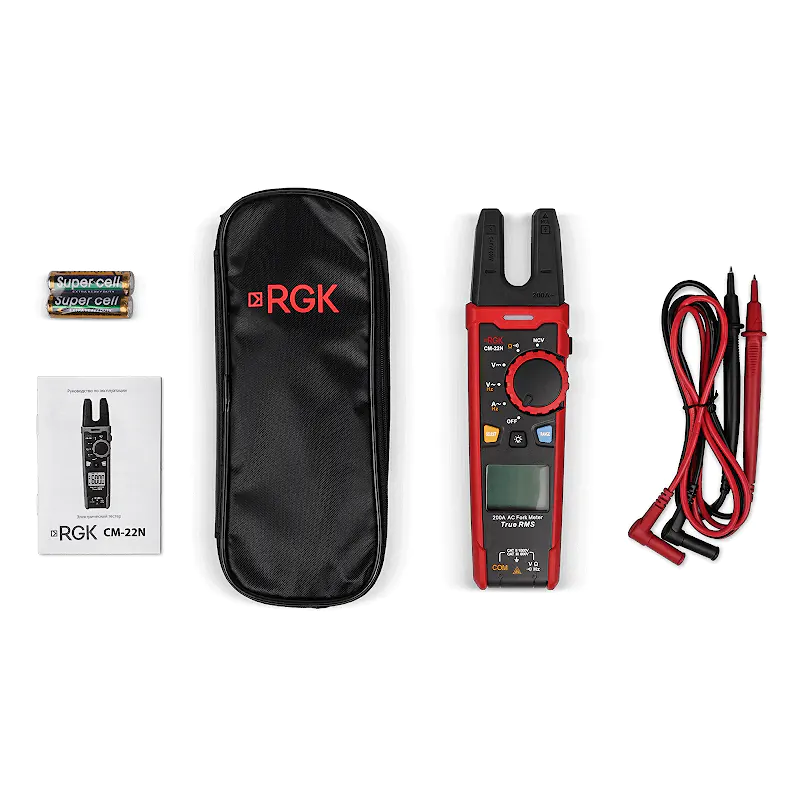 Токовые клещи RGK CM-22N поставляются в мягком чехле вместе с комплектом тестовых проводов и батареями питания. Дисплей оснащен яркой подсветкой для улучшения обзора в слабоосвещенных местах. При проведении работ в темных замкнутых пространствах, таких как распределительные коробки, можно включить встроенный светодиодный фонарик. В целях экономии энергии устройство автоматически выключается через 15 минут после отсутствия каких-либо действий с клавишами. Индикатор низкого заряда батарей подсказывает, когда необходимо заменить элементы питания для поддержания прибора в рабочем состоянии.