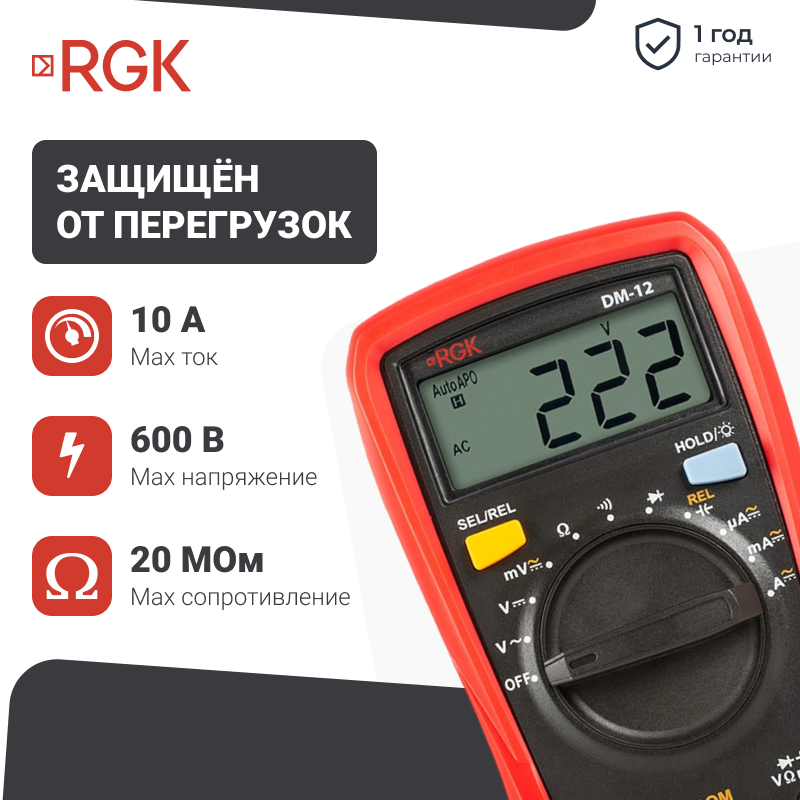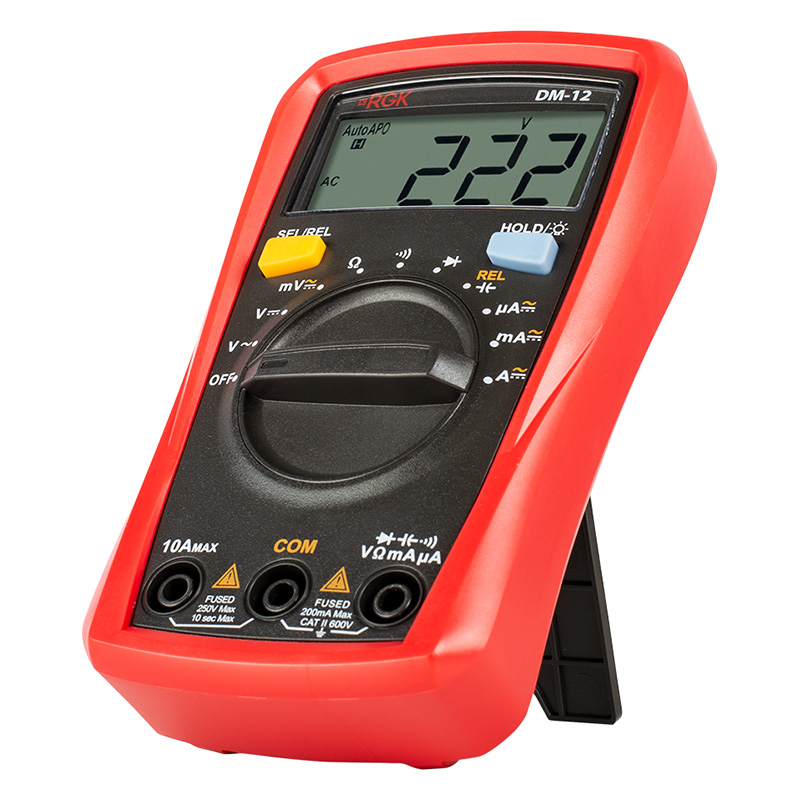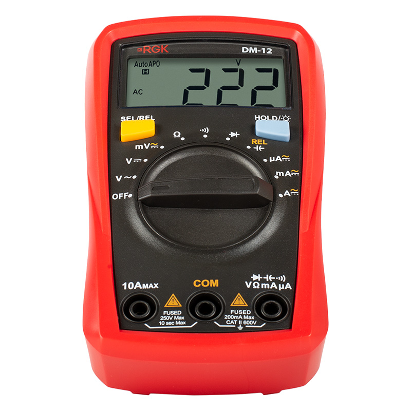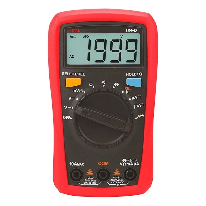 Цифровой мультиметр RGK DM-12 – прибор для измерения различных параметров электросети, от напряжения в диапазоне 200 мВ - 600 В до сопротивления 200 Ом - 200 МОм. Переносная модель поставляется в комплекте с измерительным кабелем с пробниками.