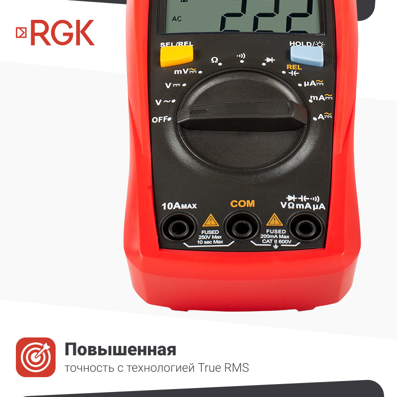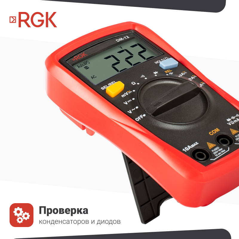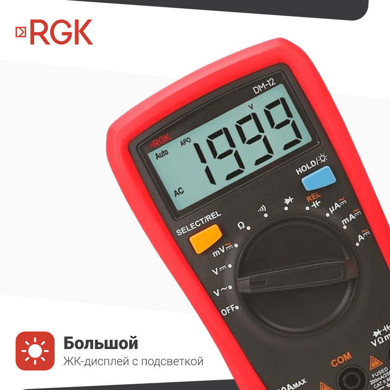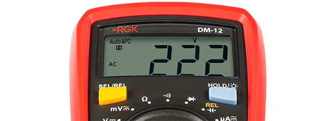 Полученные данные фиксируются на экране мультиметра RGK DM-12 нажатием кнопки HOLD. Это удобно т.к. позволит переписать информацию в блокнот или показать результат измерений коллеге. Если удерживать HOLD нажатой более 2 с, то активируется подсветка экрана. Она упрощает считывание данных при ярком свете.