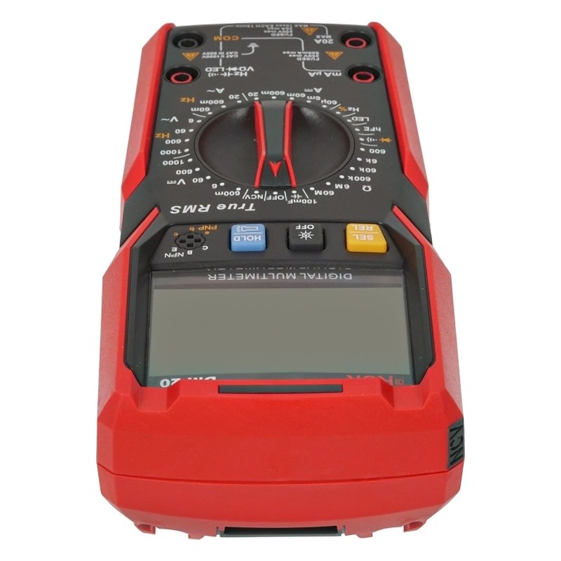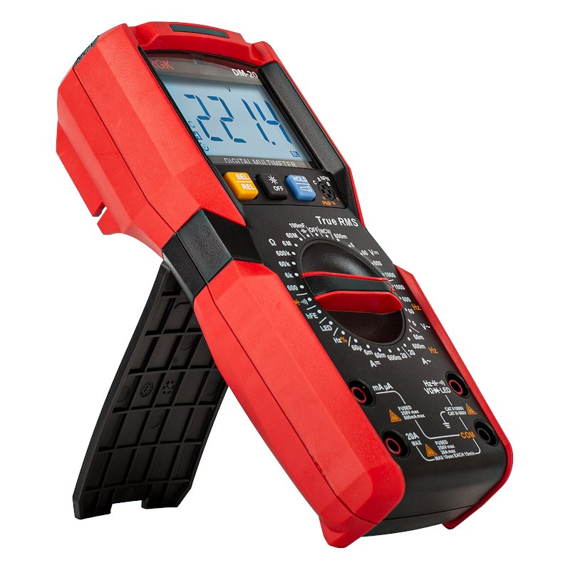 При работе в темноте профессиональный мультиметр RGK DM-20 самостоятельно, с помощью специального сенсора определит недостаточный уровень освещения и включит подсветку дисплея. Для повышения безопасности и комфорта измерений рабочую область можно дополнительно подсветить встроенным светодиодным фонарем. Полученные значения фиксируются на экране кнопкой HOLD, что позволяет удобно произвести запись в журнал. С помощью откидной поставки можно надежно установить прибор на горизонтальную поверхность и освободить руки для удобных манипуляций с щупами и другим оборудованием.