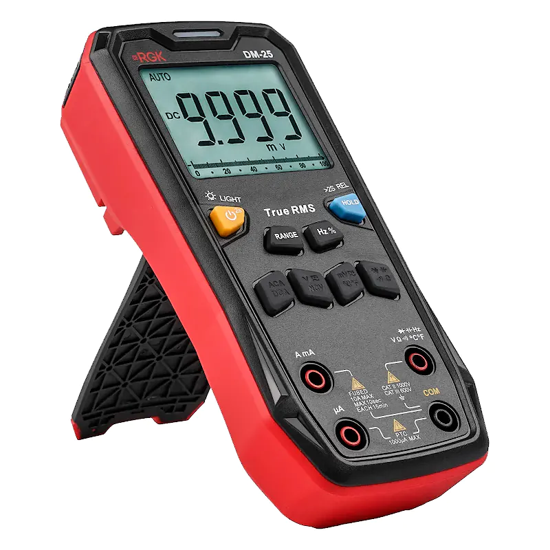 Дисплей оснащен яркой подсветкой для улучшения обзора в слабоосвещенных местах. Индикатор низкого заряда подсказывает, когда необходимо заменить батареи для поддержания устройства в рабочем состоянии и сохранения точности измерений. На задней панели предусмотрена откидная подставка для установки на стол и удобного снятия показаний. В целях экономного энергопотребления прибор автоматически отключается через 15 минут при отсутствии каких-либо действий с функциональными клавишами. Мультиметр RGK DM-25 поставляется вместе с элементами питания, термопарой типа «К» и комплектом измерительных кабелей с пробниками.