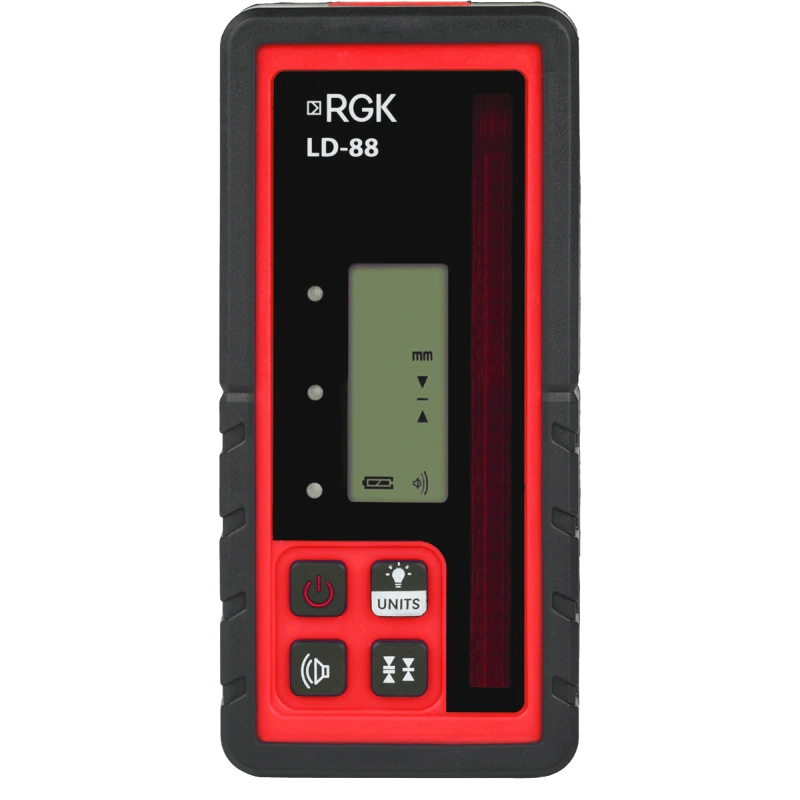 Светодиоды в передней части приемника лазерного луча RGK LD-88 сигнализируют об отклонении приемника от нулевой отметки. В зависимости от положения луча – выше или ниже места нуля – индикаторы загораются различными цветами. Когда луч приведен в нулевую точку, загорается зеленый индикатор. Также, имеется звуковая индикация положения лазерного луча.