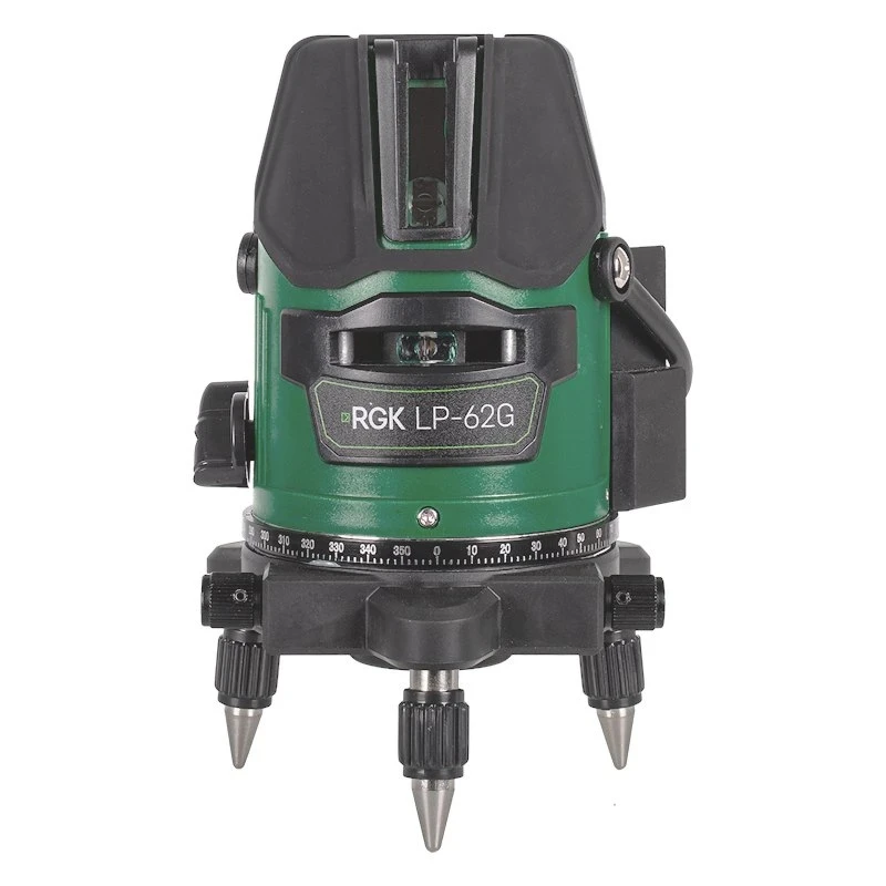 Прибор легко выставить в горизонт благодаря регулируемым ножкам и встроенному трегеру. Точная подстройка возможна с помощью бесконечного винта наводки и градуированного лимба. А если нужно использовать штатив — предусмотрено крепление с резьбой 5/8". Все это обеспечивает стабильность RGK LP-62G даже на сложных поверхностях.