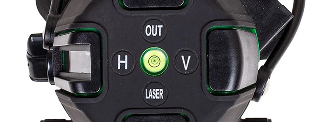 Лазерные линии включаются как по отдельности, так и вместе. Во втором случае образуется лазерный крест. Помимо этого, модель может проецировать лучи под наклоном. Для этого необходимо заблокировать маятник кнопкой OUT и поворотом тумблера, когда прибор выключен.