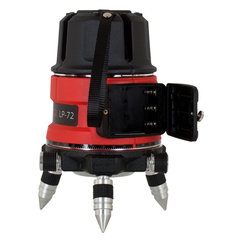 Для установки лазерного построителя плоскостей в правильное положение есть встроенный пузырьковый уровень, а также регулируемые ножки. При этом маятниковый компенсатор выравнивает линии, если прибор отклонен от горизонта на 4°. Функция отключается отдельной кнопкой на панели управления. Это позволит проецировать лазерные лучи под наклоном, а также безопасно перевозить модель в условиях тряски.