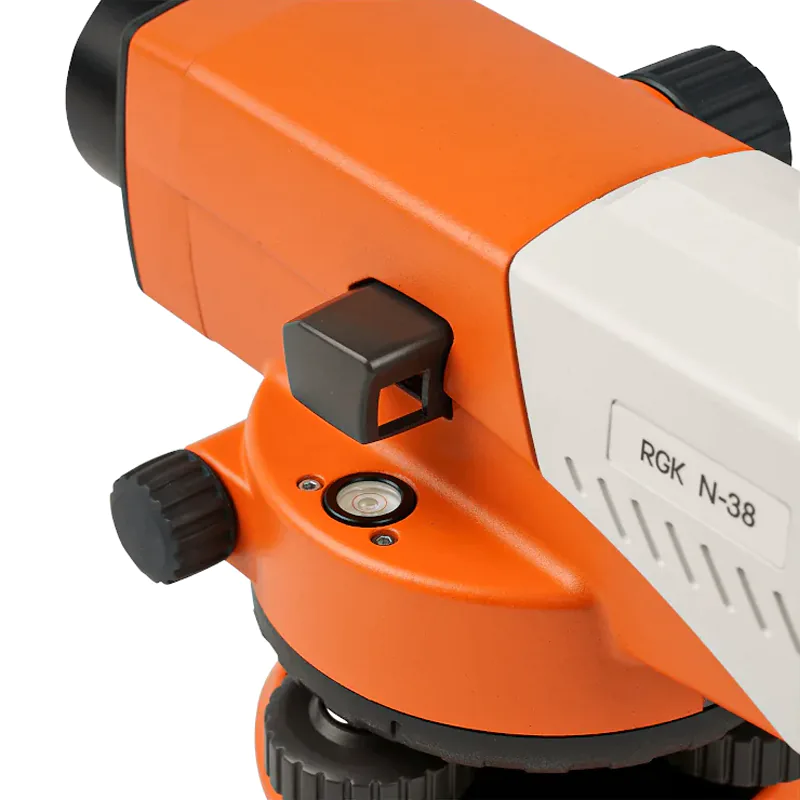 Для настройки нивелира RGK N-38 используются наводящие винты с плавным ходом, для контроля горизонта — встроенный пузырьковый уровень. Зеркальце для наблюдения за круглым уровнем упрощает процесс выравнивания. За счет линзы с просветляющим покрытием изображение хорошо различимо даже в сумерках, при пасмурной погоде или слабом освещении. Оптика сохраняет прозрачность на сильном морозе.