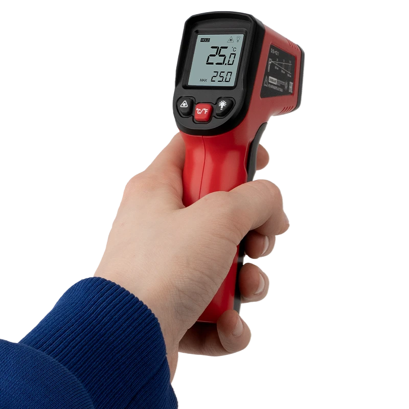 Инфракрасный пирометр RGK PL-7 находит широкое применение в быту, тяжелой промышленности, сфере строительства и ЖКХ. Легкий и простой в использовании прибор измеряет температуру поверхностей твердых тел на расстоянии бесконтактным способом. Оптическое разрешение составляет 12:1. Одноточечный лазерный указатель упрощает наведение прибора на объект. Пирометр автоматически выполняет корректировку значений с учетом температуры окружающей среды и введенного коэффициента излучения поверхности от 0,1 до 1. В качестве элементов питания используются две 1,5-вольтовые батарейки, которые устанавливаются в рукоятку прибора.