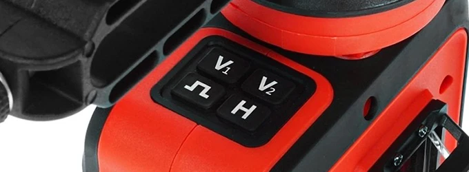 Горизонтальный и вертикальные лучи включаются по отдельности. Для этого на корпусе есть соответствующие кнопки. Переключать лазерные линии также можно с пульта дистанционного управления, который поставляется в комплекте. Вы сможете использовать только нужные лучи, что поможет сберечь энергию аккумулятора.