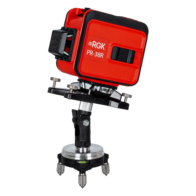 Для лучшей видимости лучей при работе в солнечную погоду используются лазерные очки. С помощью них лазерные линии становятся более четкими и яркими. Построитель плоскостей RGK PR-38R можно зафиксировать на стене. Для этого в комплекте есть металлическая пластина, а также магнитный крепеж. Подъемная площадка позволит работать в нескольких сантиметрах над полом. Это пригодится при укладке плитки. Также есть трегер. Его ножки регулируются по высоте, что поможет выравнивать положение прибора на кривом полу. Лазерный уровень с дополнительными аксессуарами поставляется в кейсе с двумя защелками, которые можно открыть за несколько секунд.