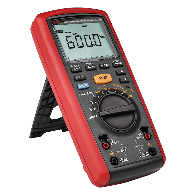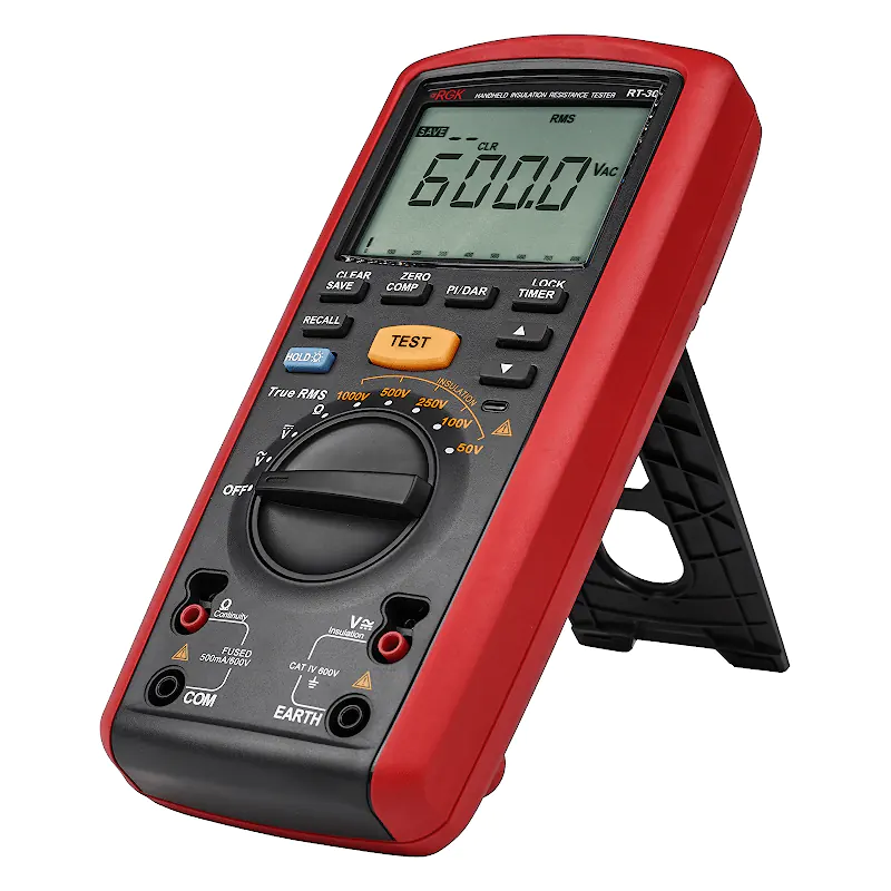 Дисплей оснащен яркой подсветкой для улучшения обзора в слабоосвещенных местах. Для удобства снятия показаний в приборе предусмотрена подставка. После 3 минут бездействия мегаомметр RGK RT-30 издает звуковой сигнал и автоматически отключается в целях экономии заряда батареи. Устройство поставляется в чехле на молнии вместе с элементами питания, комплектом проводов, измерительными наконечниками и зажимами типа «крокодил».