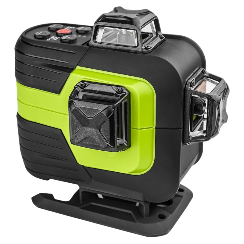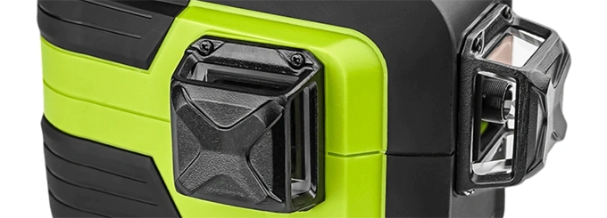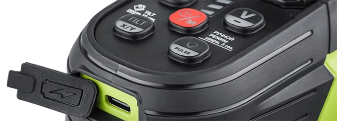 Круговые проекции на 360 градусов позволяют охватить все пространство без перемещения прибора. Функция поочередного отключения лучей помогает экономить заряд батареи, оставляя активными только нужные линии. Регулировка наклона линий осуществляется дистанционно с пульта или кнопок на панели, без изменения положения устройства. Яркие зеленые лучи обеспечивают хорошую видимость даже при ярком освещении, а работа в импульсном режиме с приемником значительно расширяет рабочий диапазон. Литий-ионный аккумулятор обеспечивает длительную работу лазерного уровня RGK в течение 6 часов при всех включенных излучателях.