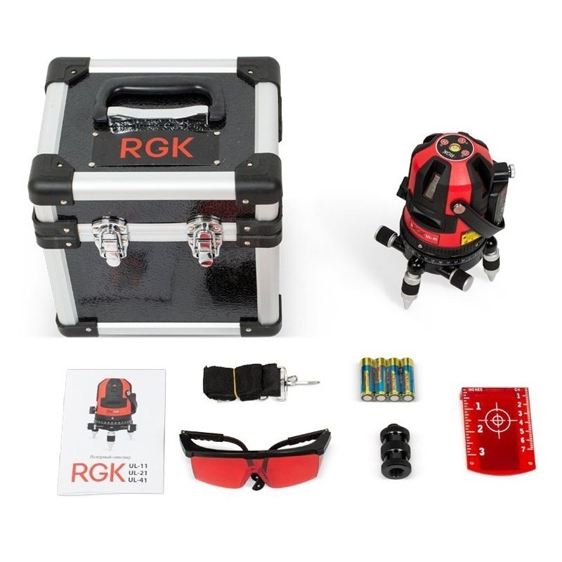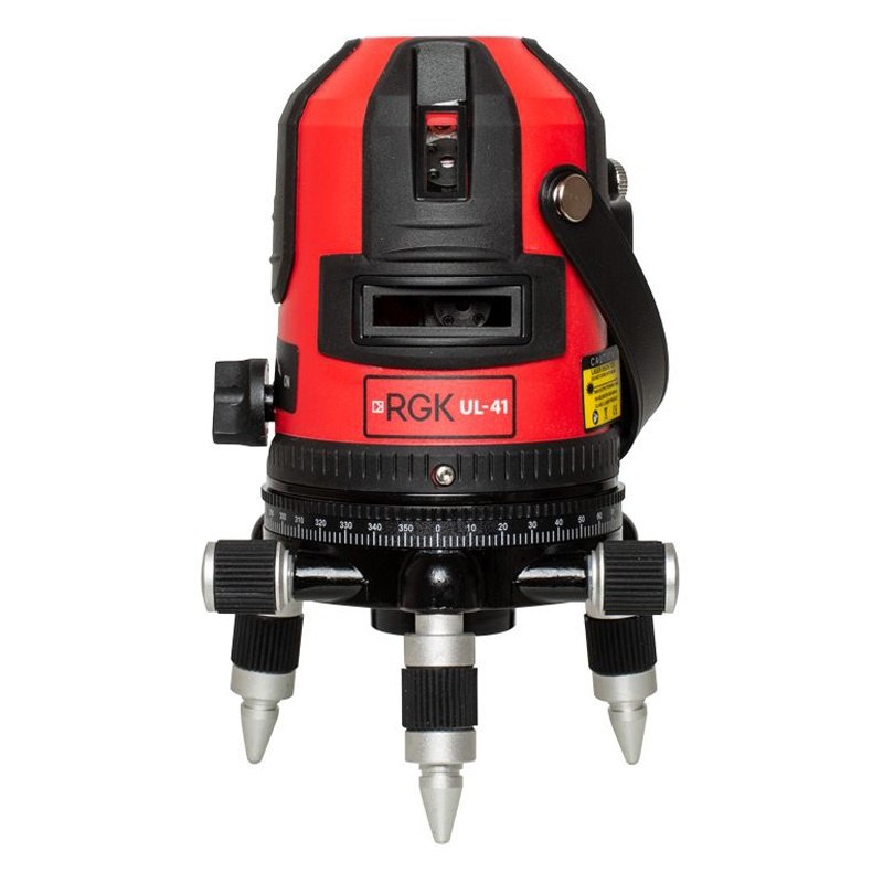 Лазерный нивелир RGK UL-41 со штативом LET-170 выстраивает горизонтальную линию и 4 вертикальных луча с дальностью проецирования до 20 м без приемника. Модель питается от 4 батареек АА, которые поставляются в комплекте.